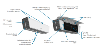- Senzorová sada zahrnuje měření pevných částic (PM10, PM2.5, PM1), obsazenosti, teploty, tlaku, vlhkosti, oxidu uhličitého (CO₂) a těkavých organických látek (TVOC).