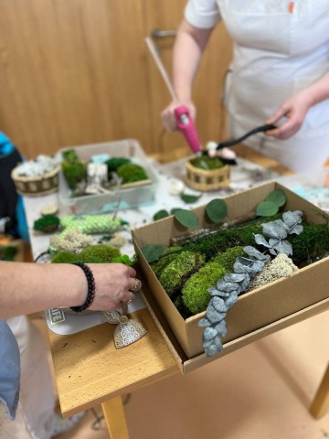 - Všichni účastníci vytvoří společně pro svou organizaci velký mechový obraz 120 x 70 cm.