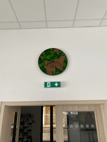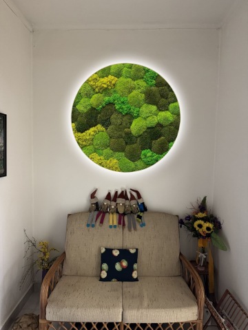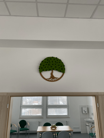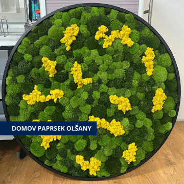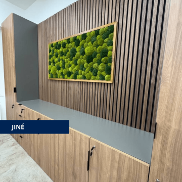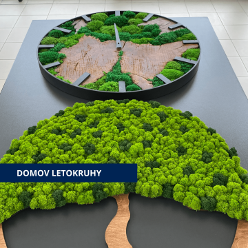Na přání pana ředitele jsme vytvořili tři originální obrazy ze stabilizovaného mechu o rozměrech 120 a 50 cm. Dominují jim teplé tóny žluté a oranžové v kombinaci minimálně dvou druhů mechu. Jeden z velkoformátových obrazů jsme navíc obohatili o decentní LED osvětlení, které dílu dodává jedinečnou atmosféru.