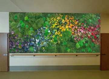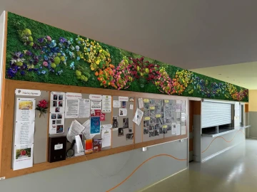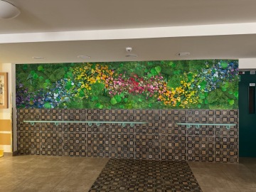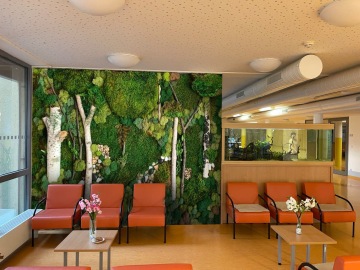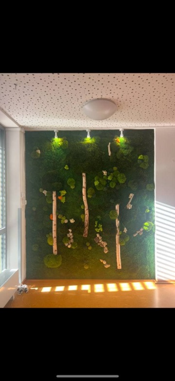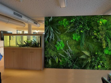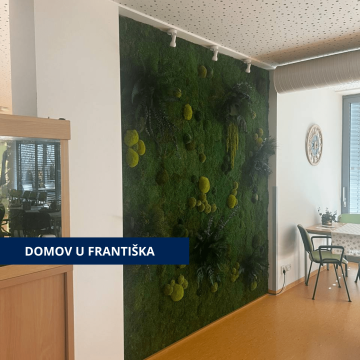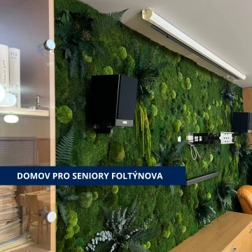 Pan ředitel přišel s úsměvem a jednoduchým zadáním: „Představu už mám, jen mi řekněte, kolik to bude stát.“ Připravili jsme deset návrhů a z nich se nakonec vybraly dvě vítězné varianty. Dnes mechová stěna zpříjemňuje prostředí jídelny a zároveň vítá každého hosta už při vstupu na recepci.