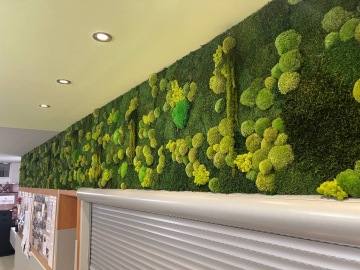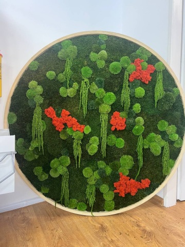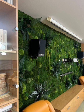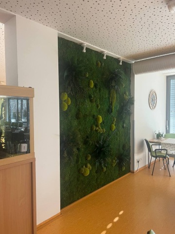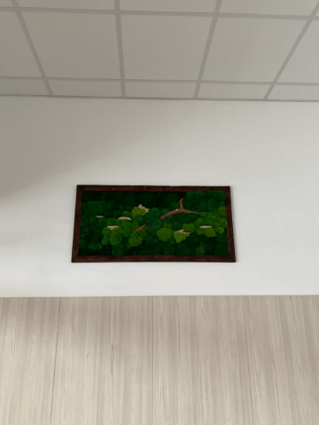 Oslovila nás stavební firma, která prováděla úpravy pražských kanceláří paní starostky. Zadání bylo jasné – biofilní design. Paní starostka měla pevnou představu o tom, co chce a co ne, ale samotný návrh obrazu nechala plně na nás. Jediným požadavkem od firmy byla specifikace barvy rámu. Výsledek? Originální mechové dílo, které do prostoru přineslo svěžest a klid přírody.